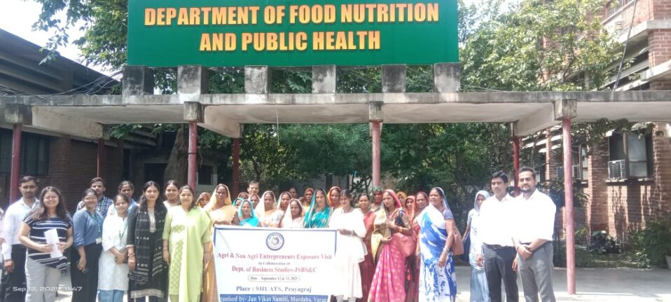 Jan Vikas Samiti organized a 2-day exposure visit to SHUATS, Prayagraj, for farmers from Varanasi and Jaunpur districts. The visit focused on modern agricultural practices, business models, animal husbandry, horticulture, Kishan vigyan Kendra and sustainable development. 20 women entrepreneurs participated, gaining knowledge and skills to improve their livelihoods and promote women-led agricultural enterprises.