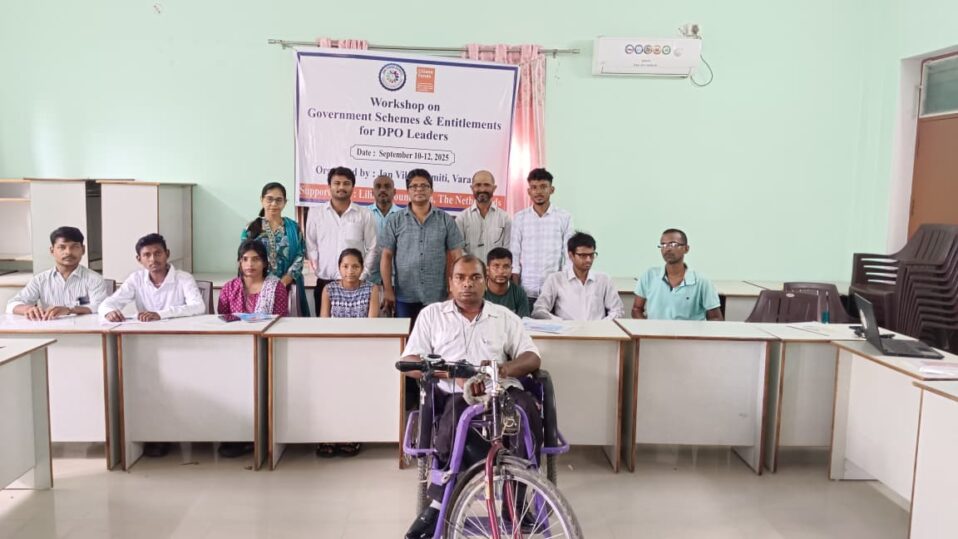 Jan Vikas Samiti organized a three-day training from September 10 to 12, 2025, at Murdaha, Varanasi, for members of Disabled People’s Organizations (DPOs) from Bihar, Jharkhand, West Bengal, and Uttar Pradesh. A total of 15 participants took part in the training, where they learned about government schemes and entitlements available for persons with disabilities. Through group discussions and shared experiences, they explored how to support others in their communities who often face difficulties in accessing their rights due to lack of information and other barriers. This training helped participants become more confident and better prepared to guide and assist persons with disabilities in their local areas.